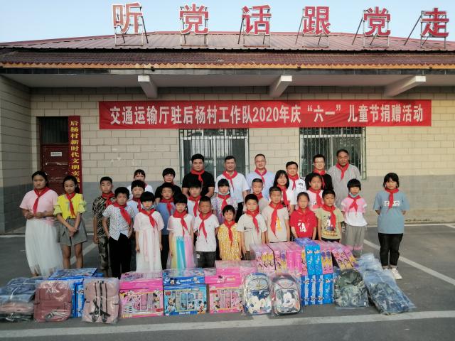 6月1日,在“六一”国际儿童节到来之际,学院驻后杨村工作队为村贫困户儿童和孤儿69人捐赠了书包、文具等学习用品。交通运输厅机关党委二级调研员赵少锋、新任驻村第一书记刘甲玉、邵店镇文化站站长周尽忠、村两委成员和儿童代表参加捐赠活动。