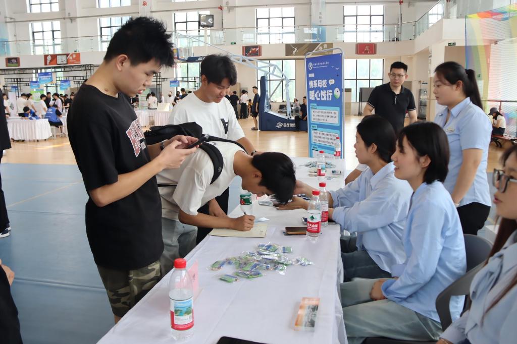 学校在招聘会现场还设置了总服务台和大学生基层就业政策宣传、就业指导、征兵宣传、心理咨询等服务台;现场开展“情系母校,暖心饯行”活动,为毕业生免费发放就餐券、矿泉水和纪念品。各院系志愿者为毕业生提供各类指引服务。
