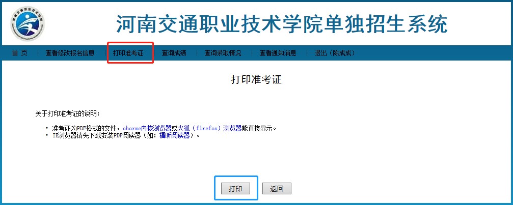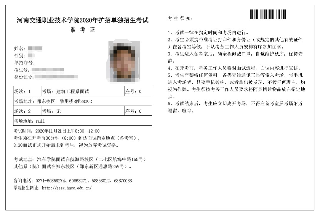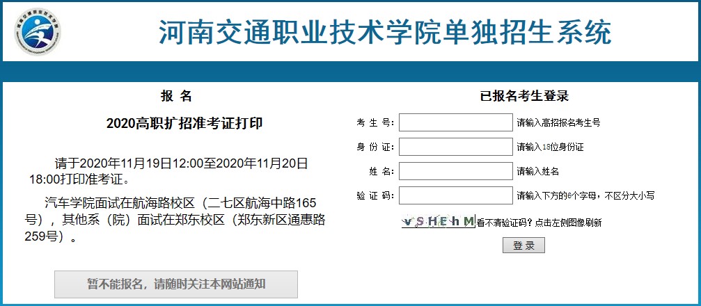 河南交通职业技术学院2020年高职扩招考试准考证打印