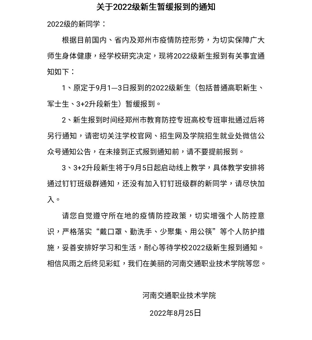 关于2022级新生暂缓报到的通知