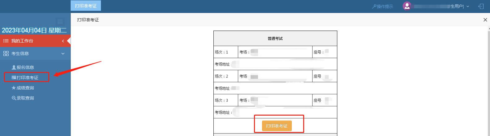 2、点击左侧箭头所指的考生信息,显示报名信息、打印准考证,如下图2。点击打印准考证即进入准考证打印选择界面。点击上方普通考试的打印准考证,即可打印本次考试的准考证。(注意:最早打印时间4月6日上午9点,未到打印时间无法打印)。