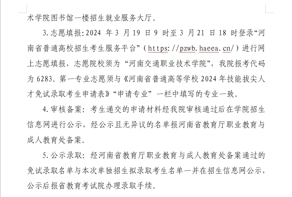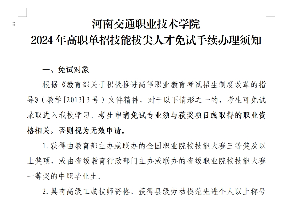 河南交通职业技术学院2024年高职单招技能拔尖人才免试手续办理须知