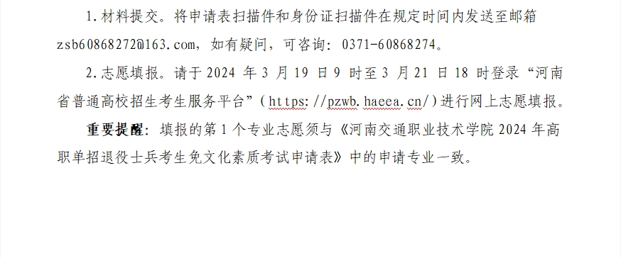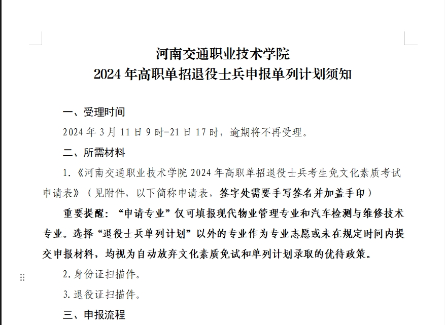 河南交通职业技术学院2024年高职单招退役士兵申报单列计划须知