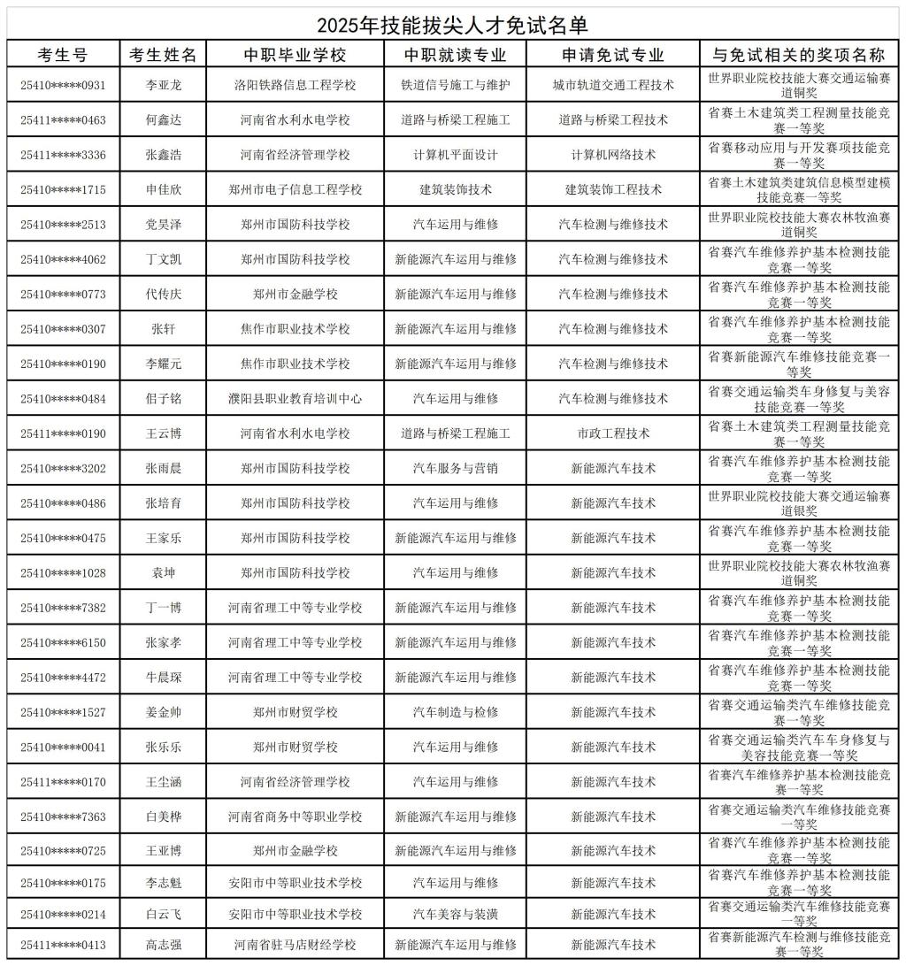 根据《河南省教育厅关于做好2025年高等职业教育单独考试招生和技能拔尖人才免试入学工作的通知》(教学〔2025〕43号)的相关要求,我校对考生提交的技能拔尖人才免试申请材料进行了严格审核,并将审核结果提交至河南省教育厅备案。经审核,共有26名考生符合免试入学条件。现将符合条件的考生名单予以公示。