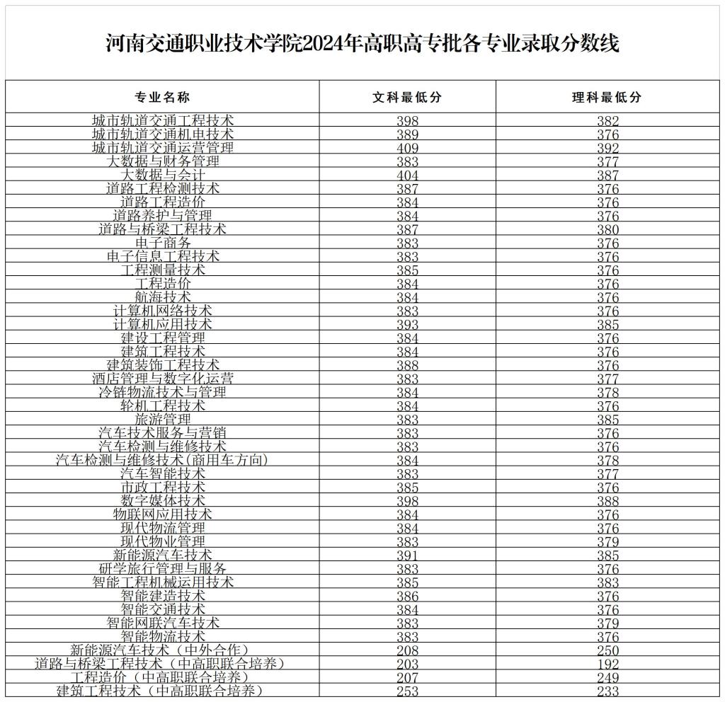 河南交通职业技术学院2024年高职高专批各专业录取分数线