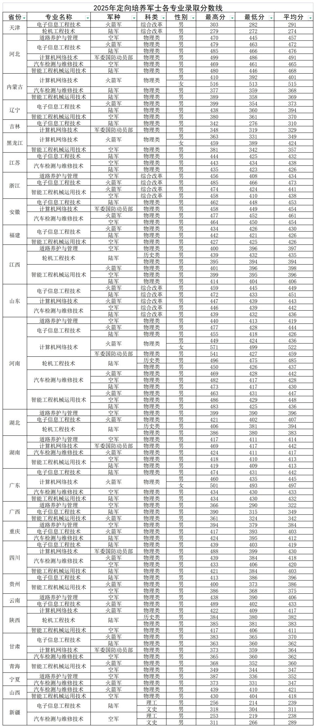 2025年定向培养军士各专业录取分数线