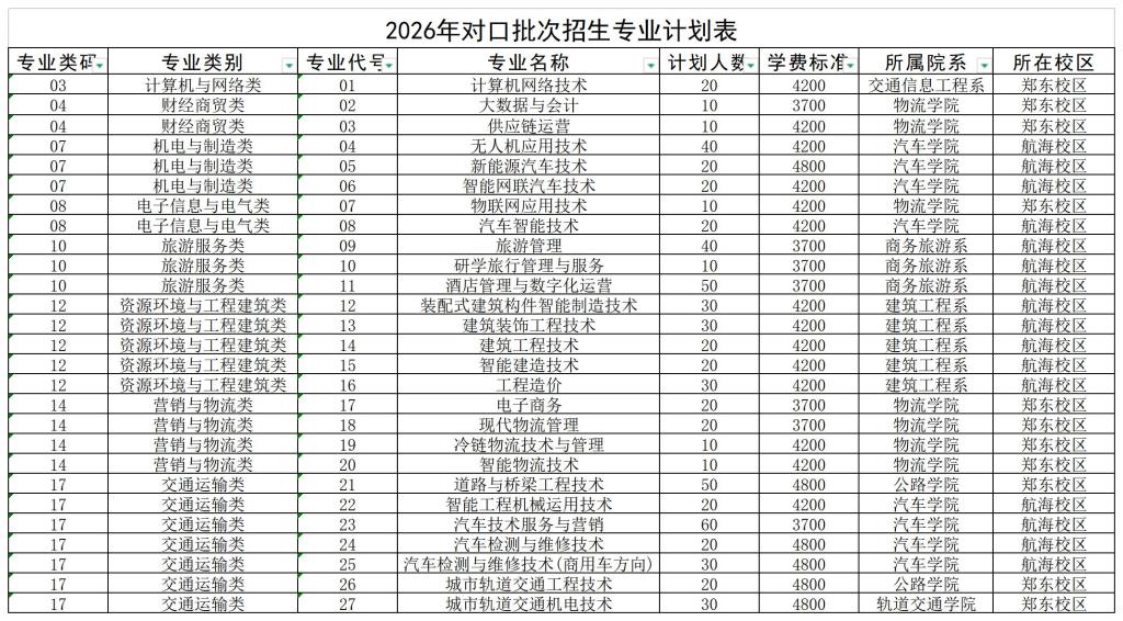 2026年对口批次招生专业计划表