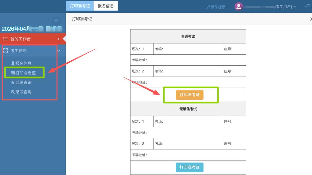 点击左侧箭头所指的考生信息,显示报名信息、打印准考证,如下图5。点击打印准考证即进入准考证打印选择界面。点击上方普通考试的打印准考证,即可打印本次考试的准考证。(注意系统界面提示,未到打印时间无法打印)。